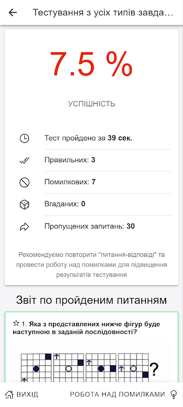 Vous pouvez passer des tests et des exercices dans leur intégralité, sur des exercices choisis, en répétant ce que vous avez appris, par parties à partir de questions aléatoires et en corrigeant les erreurs commises dans les questions où une erreur a été commise.
