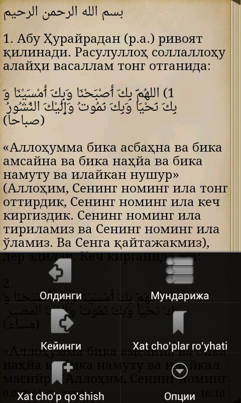 Ушбу дастурга Расулуллоҳ соллаллоҳу алайҳи васалламдан ворид бўлган тонгда ва кечки пайтларда ўқиладиган дуолар киритилган.