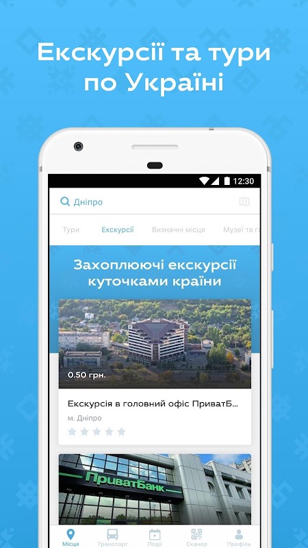 Тури та екскурсії, події Вашого міста, розваги та квитки на транспорт, готелі та ресторани всієї країни в одному додатку!