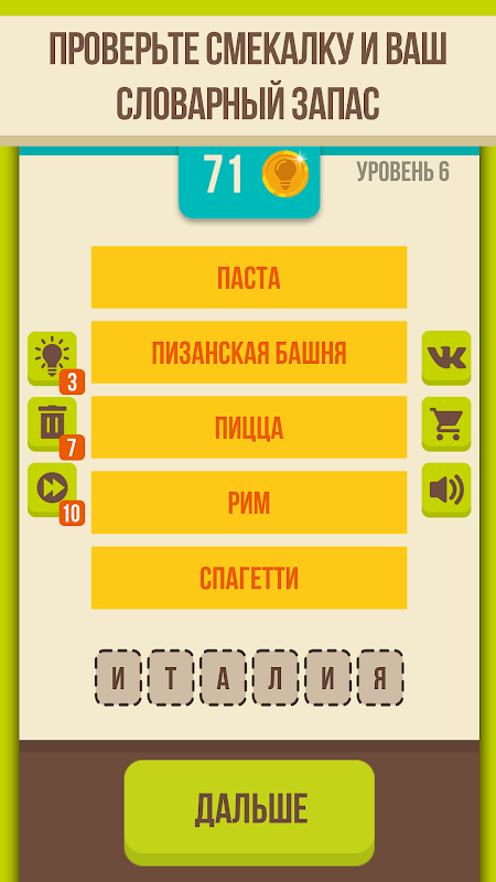 Монеты в словесной игре можно использовать для получения подсказок. Для упрощения игры есть три подсказки и возможность спросить у друзей.