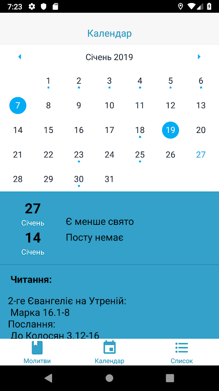 Є календар, який показує пісні дні, великі свята та читання з Біблії на кожен день.