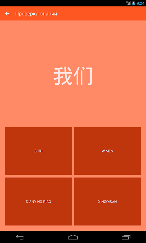 L'application de mémorisation de mots et de caractères chinois entraîne la mémorisation d'un caractère, sa transcription, son son en chinois et sa traduction en russe.
