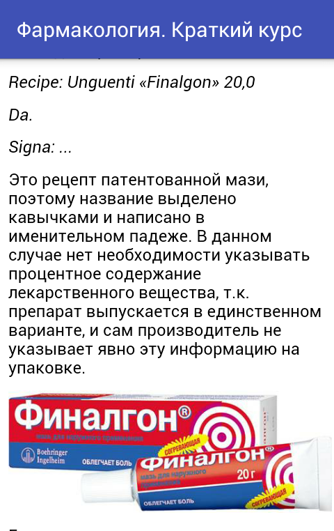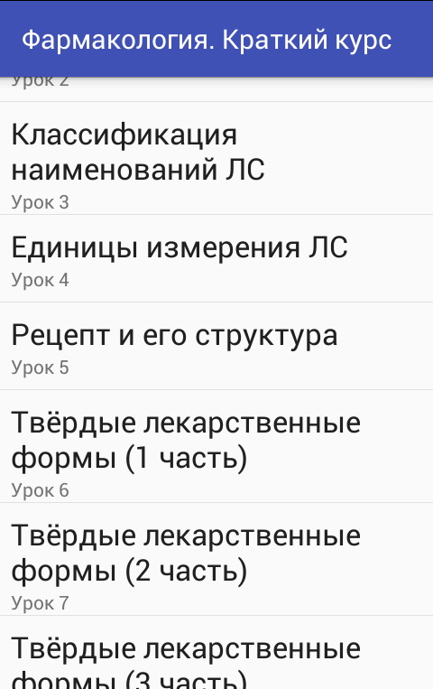 Cette version est déjà démonté des sujets tels que la pharmacocinétique, les formes posologiques, prescriptions, etc. À l'avenir, les leçons liste sera mise à jour, il est également prévu d'ajouter des tests d'auto-examen.