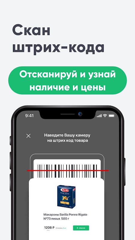Scannez le code-barres d'un article pour voir la disponibilité et le prix dans un magasin à proximité et voir s'il y a une bonne affaire dessus. Un clic de plus - et le produit est ajouté à la liste de courses ou au panier pour commander des courses à domicile.