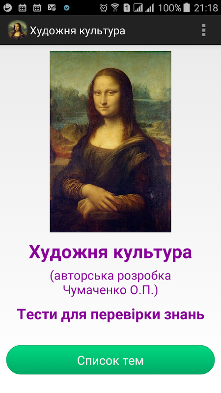Ви зможете перевірити власні знання і визначити для себе чи добре Ви розумієтесь у шедеврах світового мистецтва. В процесі проходження тестів Ви отримуєте якісні знання з історії та теорії світової художньої культури. Навіть якщо Ви вибрали невірну відповідь Ви завжди зможете скористатись бонусною спробою і через декілька секунд Ви знову отримаєте можливість зробити свій вибір. Ви ознайомитесь з жанрами живопису: батальним, натюрмортом, портретом; шедеврами античної скульптури; з творами відомих грецьких драматургів; візантійськими базиліками; архітектурою Середньовіччя (романським та готичним стилями); живописом, музикою та модою Ренесансу, та багато іншим.