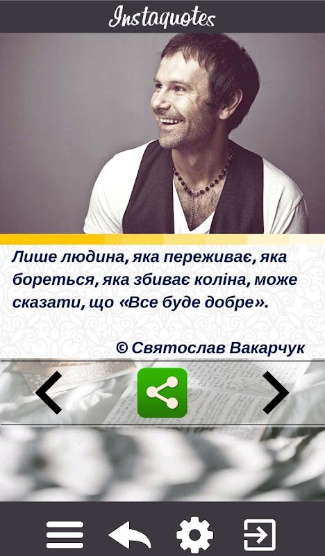 * Ces flèches sont séparées par un bouton vert Partager, avec lequel vous pouvez partager des citations non seulement sur Instagram, mais aussi sur Facebook, WhatsApp, Viber, Gmail, Hangout, Messenger, etc.