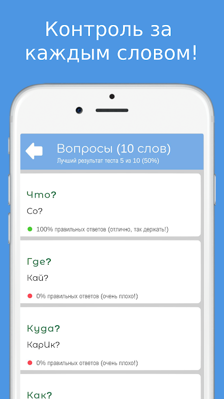 Après avoir réussi le test sur le sujet sélectionné, vous pouvez visualiser les erreurs. De plus, le résultat du test pour chaque sujet est enregistré, votre objectif est d'apprendre à 100 % tous les mots du sujet sélectionné.