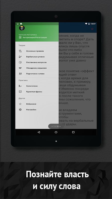 Это приложение поможет Вам: отличать, в каком контексте и при каких вопросах ваши аргументы ничего не значат или, наоборот, являются решающими; устранить противоречия в разговоре с собеседником; научитесь правильно использовать различные вербальные уловки; находчиво и элегантно устранить поставленные для Вас ловушки; в горячих спорах не терять головы и вести себя уверенно, выучите некоторые ядовитые фразы, а так же многое другое!