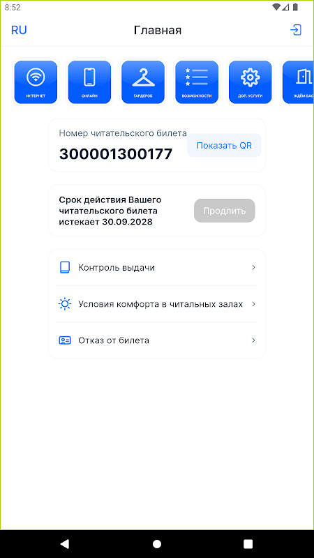 - Carte de bibliothèque électronique : créez et enregistrez une copie électronique de votre carte dans l'application. Désormais, il est toujours à portée de main et vous pouvez l'utiliser pour accéder aux ressources de la bibliothèque.