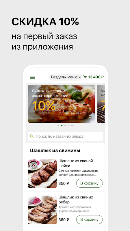 Installez l'application et commandez la livraison de brochettes juteuses parfumées cuites au charbon de bois à partir de viande de ferme du restaurant "Shish kebab City"!