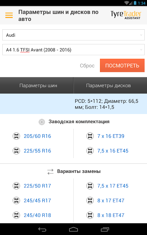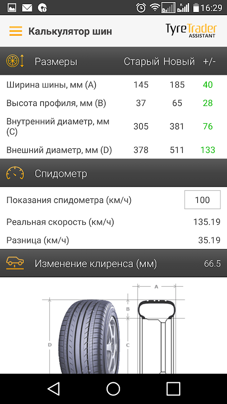 - Calculateur de pneus vous permet de choisir la taille de pneus lors du passage à un diamètre différent, ou d'évaluer les différences dans les paramètres géométriques de la roue au cours de la transition vers une taille standard différente