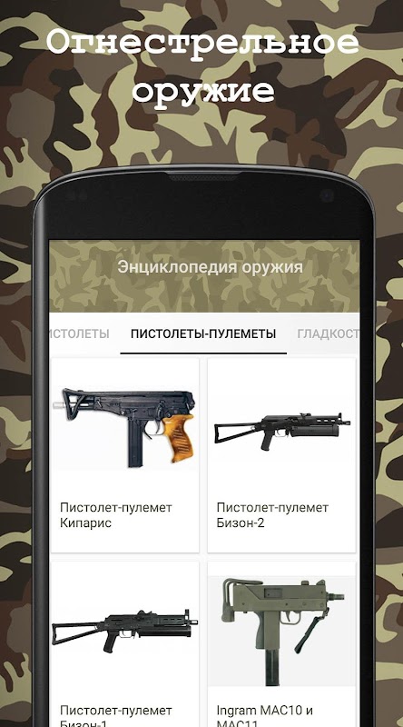 Encyclopédie des armes à feu. Dans cette application, vous trouverez des informations complètes sur tout type d'armes à feu et d'armes légères, non seulement des modèles russes mais aussi des fabricants étrangers. Fusils, carabines, pistolets, revolvers, armes à canon lisse, mitraillettes (pp) et bien plus encore, vous trouverez dans cette application.