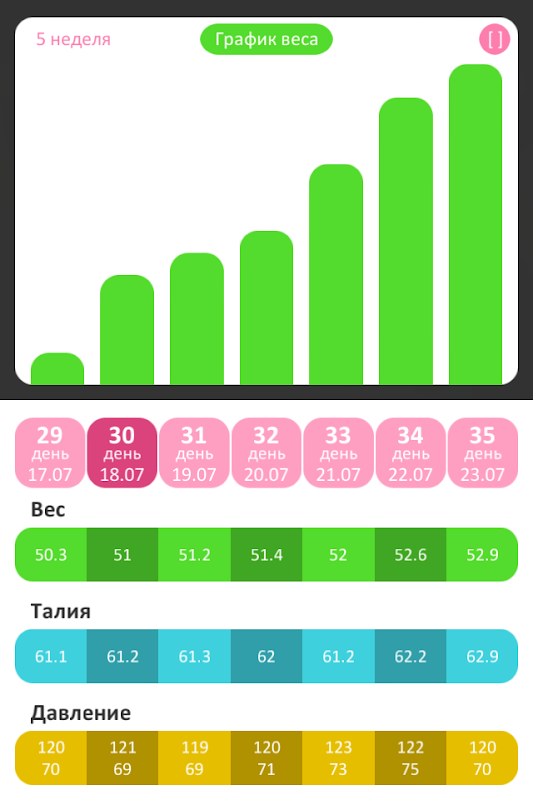 vous donne la possibilité de surveiller votre grossesse, indiquer le poids, la taille de la taille, la pression et voir les informations générales pour la semaine. Maintenir votre journal personnel de l'humeur de la grossesse, le bien-être.