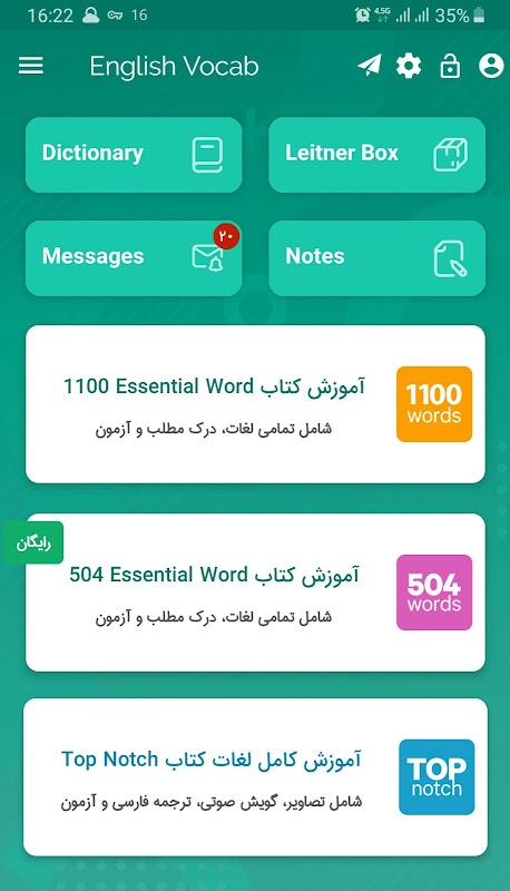Dans l'application 504 mots, l'accès aux mots du livre 504 mots essentiels, au dictionnaire anglais vers farsi, au dictionnaire persan vers anglais et à la boîte Lightner est entièrement gratuit.