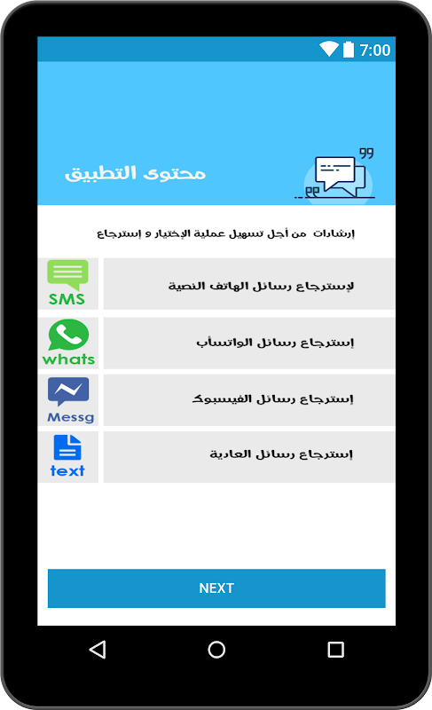يشتغل تطبيقنا على استرجاع المحذوفة والمحادثات الخاصة بالوتسأب والفاسبوك والرسائل من الهاتف أو بطاقة الذاكرة بكل يسر كل ما عليك فعلهه الدخول لتطبيق لسترجاع الرسائل