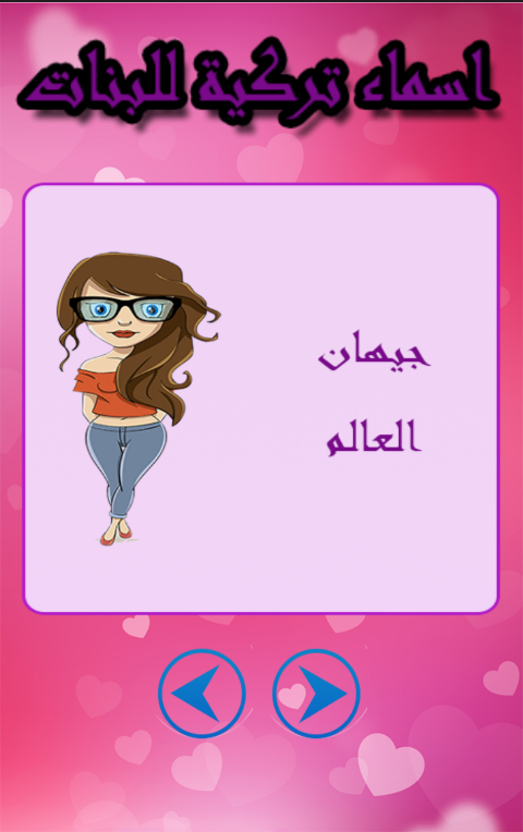 نقدم لكي اختي الكريمة اجمل اسماء بنات تركية و نقدم لكي ايضا جملة اسماء بنات مزخرفة التطبيق عبارة عن اسما بنات على صور داخل خلفيات مكتوب عليها الاسماء و يضم التطيق اروع المعاني واجمل بنات تركيا نادرة وحتوي التطبيق على اكتر من 48 اسم تركي و اكترها شهرة من مسلسلات تركية من حلقات مسلسل سامحيني لتسهل عليك تعارف بنات تركية و بنات المغرب للاسماء اجمل بنات العالم .