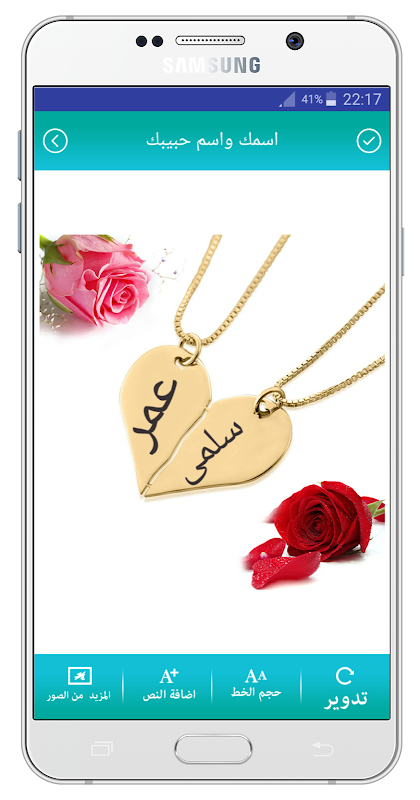 لن تبحث بعد الان عن تطبيقات اخرى لكتابة اسمك او ايمك واسم حبيبك على تشكيلة رائعة من الصور التي تناسب كل المناسبات , و يمكنك الكتابة على الصور باللغة التي تريد و التحكم في حجم الخط واللون و كذلك كتابة نص مرافق لاسمك و اسم حبيبك , و يمكنك كذلك استعمال الصور المنشأة في صور الحساب و مشاركتها مع اصذقائك و يوفر التطبيق مميزات رائعة سوف تعجبكم بالتأكيد