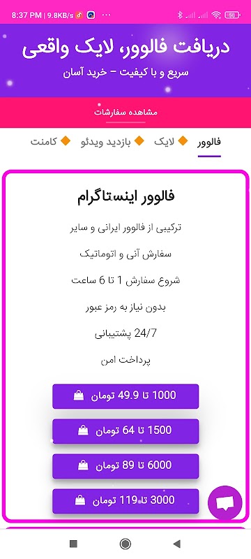 با این برنامه میتونید بسته های متنوع لایک و فالوور و کامنت و ... را براحتی استفاده کنید.