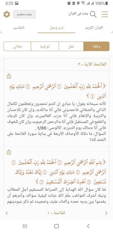 1 - الوقفات التدبرية: سبع وقفات تدبرية اعتنت بمقاصد الآيات (الإيمانية, والتربوية وغيرها) استخرجناها من ستة عشر كتابا من أمهات كتب التفسير المعتمدة لدى أهل السنة والجماعة, والتزمنا فيها بنص كلام المفسر إلا إن وجد خطأ في بعض الألفاظ من حيث الطباعة أو اللغة والإعراب [ ]. وذكرنا في آخر كل وقفة مرجعها؛ معتمدين في ذلك كر اسم المفسر بدلا من اسم الكتاب, ثم رقم الجزء والصفحة وفق الطبعة المعتمدة في المشروع
