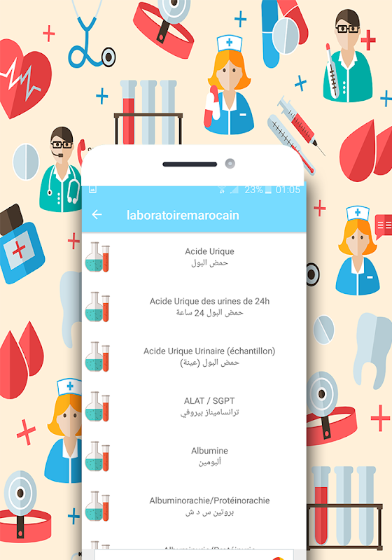 Nous vous proposons l'application de l'analyse médicale du prix et des explications pour vous fournir toutes sortes d'analyses requises par la plupart des médecins au Maroc et cette application vous permet de connaître le prix des tests de laboratoire que vous travaillez sans vous rendre dans les laboratoires pour en savoir davantage sur les prix de l'analyse et l'application de l'analyse médicale ainsi que sur les prix et les explications. Les informations médicales sur les tests et leur classification ainsi que la durée des résultats et l'application sont disponibles sur tous les noms d'analyse scientifique où même les étudiants peuvent en bénéficier, en particulier les étudiants en sciences de laboratoire médical et les étudiants en médecine en général.