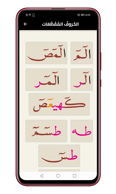 Chaque lettre a une image avec la prononciation selon le type de signes diacritiques, y compris le damma, le fatha, le kasra, le tanween, l'intensité et la durée