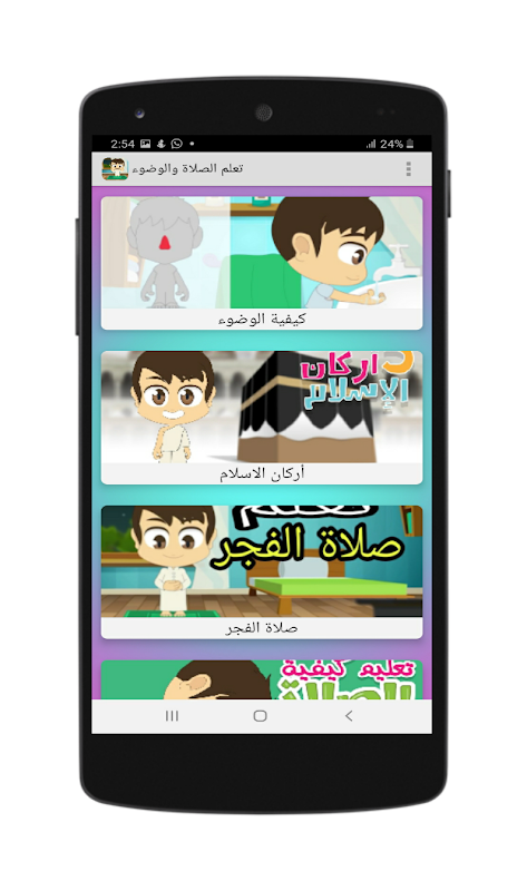 Pour les enfants et les adultes en affichant une vidéo explicative pour chacune des ablutions et prière en détail, chaque prière est divisée en prières Fajr, Zuhr, Asr, Maghrib et Isha.