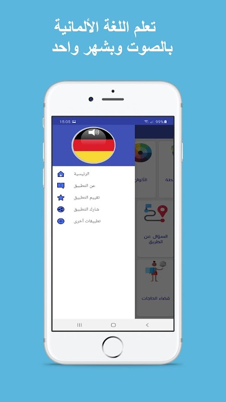 L'application contient les mots et les phrases les plus importants de la langue allemande traduits en arabe avec la façon dont ils sont prononcés avec le son et l'image