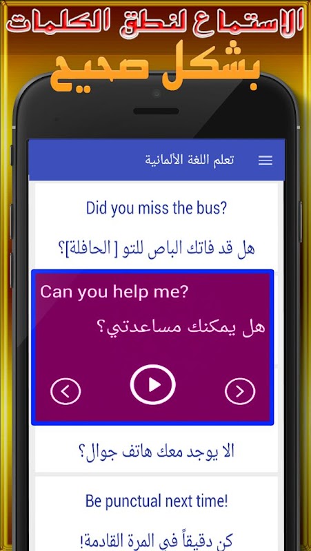 تعلم اللغة الالمانية بسهولة تطبيق المفيد جدا لتمكين من تعلم الالمانية دون الحاجة الى مدرس و ذلك عن طريق تعلم وتعليم اللغة الالمانية بالعربية بدون انترنت وذلك بواسطة ترجمة عربي الماني اي ترجمة من العربية الى المانية عن طريق الدروس في هذه اللغة.