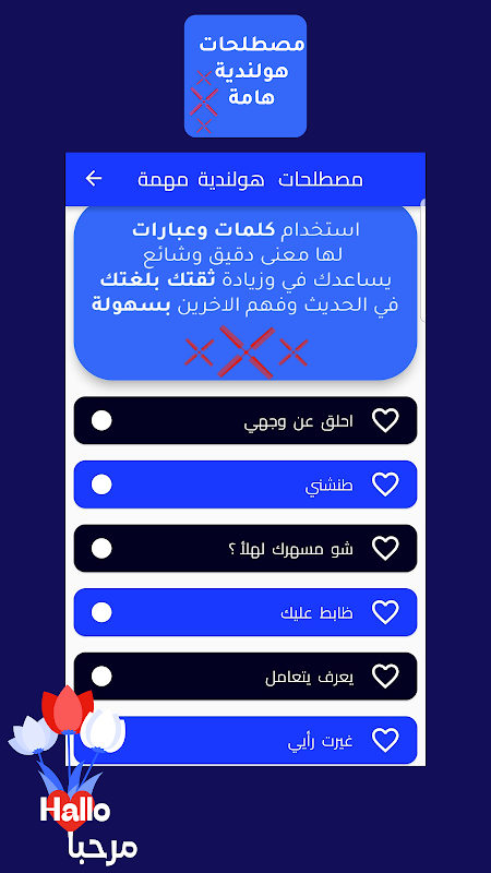 Vous aimez le néerlandais et souhaitez l'apprendre ? Avec l'application « Hi Hollander » (Apprendre le néerlandais), apprenez tout le vocabulaire et les expressions néerlandaises utilisées dans de nombreux domaines de la vie quotidienne, pour construire la conversation et le dialogue dont vous avez besoin au quotidien, avec audio et vidéo, et traduction en arabe. Compte tenu de l'importance de l'apprentissage des langues en ce moment, nous avons créé l'application « Hilo-Hollander » pour apprendre le néerlandais. Grâce à elle, vous apprendrez tout ce que vous devez savoir sur la langue néerlandaise, de la grammaire complète aux expressions courantes, en passant par les conversations quotidiennes dans tous les domaines. Des centaines d'histoires traduites en arabe sont présentées de manière simple et utile.