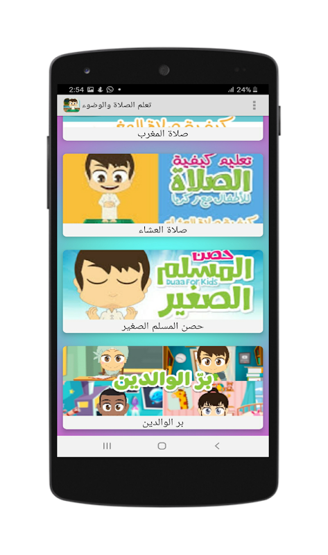 Pour les enfants et les adultes, en affichant une vidéo explicative pour chacune des ablutions et prières en détail, chaque prière est divisée en prières Fajr, Zuhr, Asr, Maghrib et Isha.