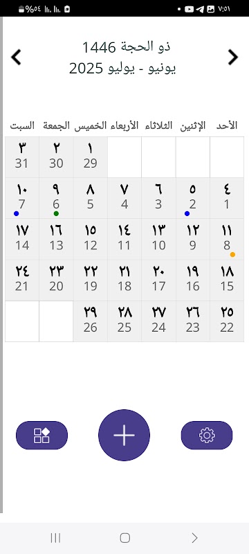 Ajouter des événements et des alertes : Ajoutez facilement vos rendez-vous et événements et définissez des alertes pour vous en souvenir. Les événements sont affichés sous forme de points de couleur (par exemple, bleu pour le grégorien et vert pour le hégirien) pour une identification facile.