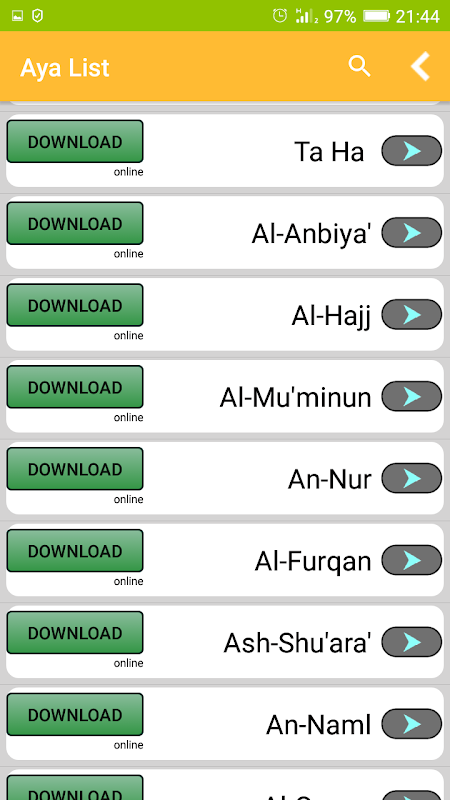 Avec la possibilité de télécharger sur le téléphone ou la mémoire externe, vous pouvez télécharger les sourates et les écouter sans Internet, et vous pouvez lire le Saint Coran directement sur Internet