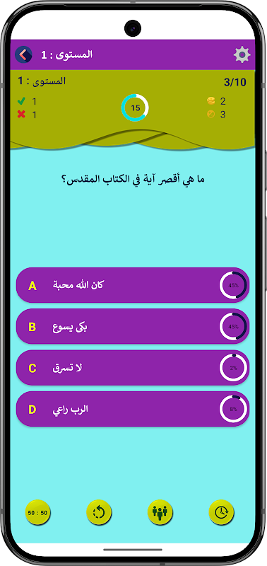 Chaque niveau propose une variété de questions liées au christianisme. Vous devez choisir la bonne réponse parmi quatre options. Pour augmenter vos chances d'obtenir la bonne réponse, vous pouvez utiliser quatre outils d'aide :