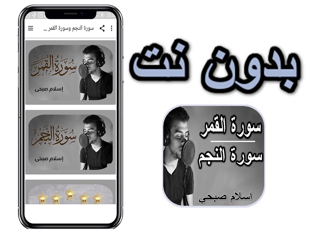 L'application contient une récitation humble de la sourate Al-Najm et de la sourate Al-Qamar avec la voix du lecteur, Islam Sobhi