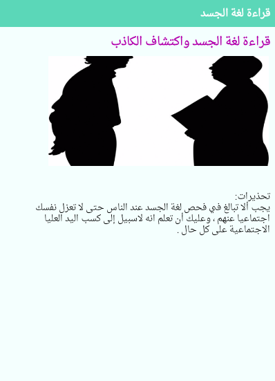 يحتوي التطبيق على عدة معلومات عن قراءة لغة الجسد