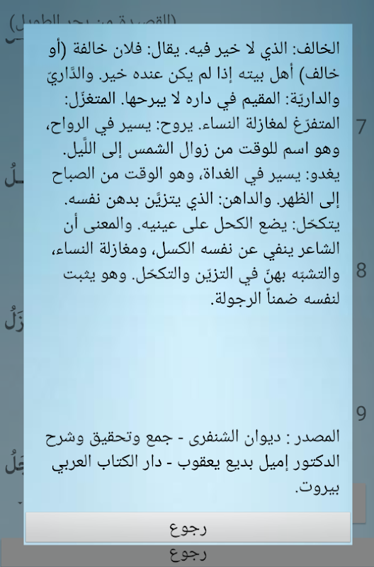Vous pouvez grâce à cette application Voir la traduction Shanfari, ou des informations sur l'analphabétisme des Arabes, et vous pouvez voir la forme de jeu de poème .. Comme vous pouvez choisir la maison des maisons de poème pour voir l'explication de la maison ou couper Arozia ou afficher une certaine variation dans les romans de la maison .. Le poème de la longue mer ..