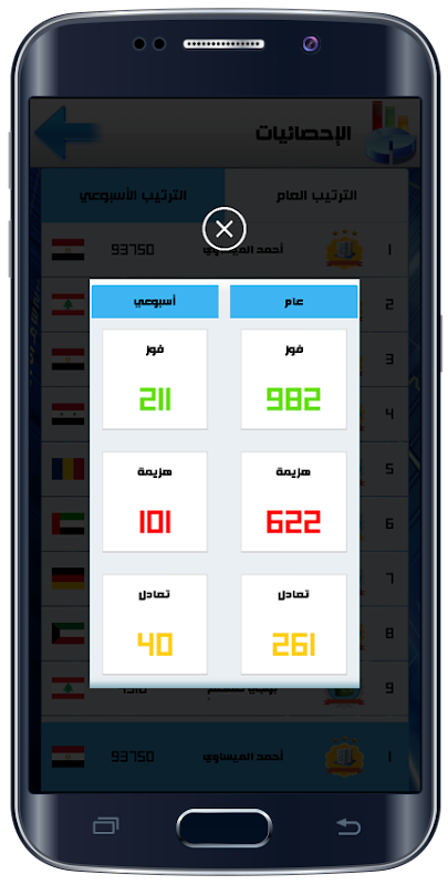 يستطيع كل لاعب متابعة ترتيبه العام و الاسبوعي و احصائيات لعدد الجولات التي فزت و خسرت و تعادلت فيها.