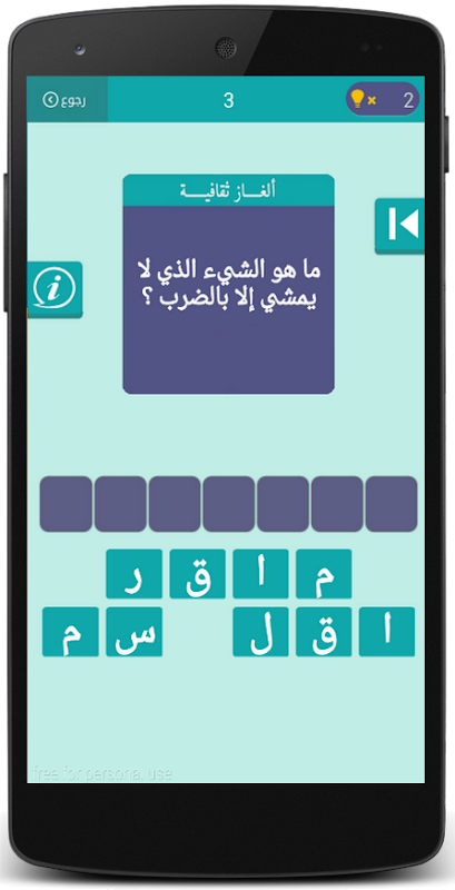 في كل مرحلة مجموعة من اسئلة المشوقة والممتعة, هذه اللعبة بجودة اسئلتها تعتبر دورة ثقافية شاملة ستثري معلوماتك بشتى المجالات, وهناك الكثبر من الاسئلة الخفيفة التي تعتمد على فطنتك وذكاءك ،ولا يخلو اي سؤال من متعة التفكير والتشويق.