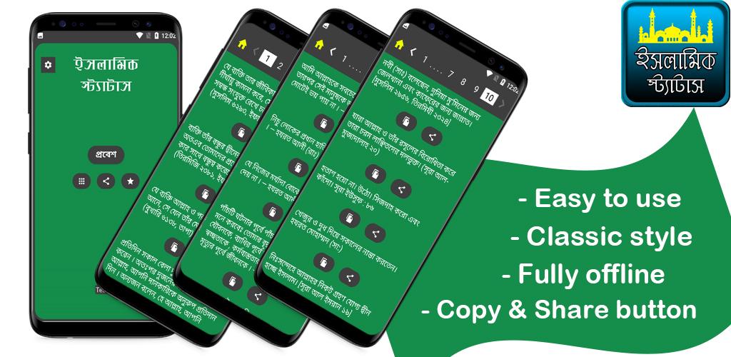 ইসলামিক বাংলা স্ট্যাটাস (statut Islamik bangla) একটি ইসলামিক উক্তি / ইসলামিক বানী সম্বলিত অ্যাপ। বাছাই করা কিছু ইসলামিক উক্তি নিয়ে তৈরি করা হয়েছে এই অ্যাপটি ।দশটি পেজ নিয়ে তৈরি করা হয়েছে অ্যাপটি। খুব সহজেই এক ক্লিকেই যে কোনো স্ট্যাটাস কপি এবং শেয়ার করতে পারবেন।