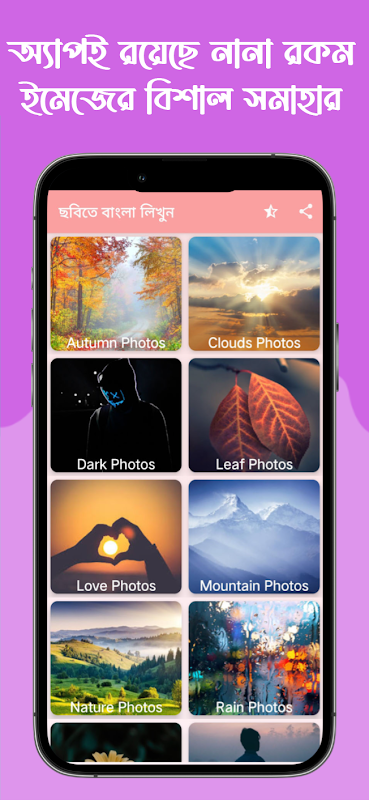 Vous pouvez sélectionner une photo dans la galerie et modifier l'image. Écrivez en bengali avec votre police préférée. Nous avons tous des émotions dans notre cœur et aimons les écrire sur des photos, publier des histoires sur divers sites sociaux et les partager avec des amis.