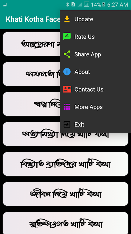 এই এপসটিতে মন মতানো সব খাটি কথা বা উপযুক্ত কথার এসএমএস পবেন, এই অ্যাপ টি ব্যবহার করতে প্রথম বার ওপেন করতে ইন্টারনেট কানেকশন লাগবে। তারপর নেটা কানেকশন ছাড়াই অ্যাপ টি ব্যবহার করতে পারবেন। আশা করি অ্যাপ টি ভালো লাগবে।খাটি কথা ফেসবুক স্ট্যাটাস ২০২১