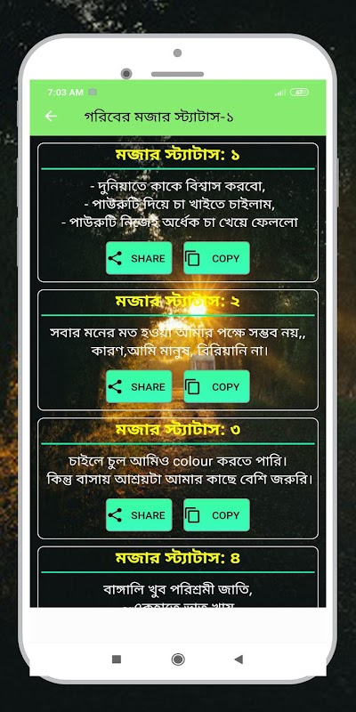 গরিবের কষ্টের স্ট্যাটাস এই অ্যাপসটি থেকে আপনারা পাবেন গরিব জীবনের কষ্টের স্ট্যাটাস-SMS Sad Status । গরিবের ভালোবাসার কষ্টের স্ট্যাটাস ও মজার স্ট্যাটাস । গরিব ও মধ্যবিও দের কষ্টের কিছু উক্তি বা স্ট্যাটাস পাবেন এই অ্যাপসটিতে । গরিব ও মধ্যবিওদের অনেক স্বপ্ন পূরন হয় না।যা এই অ্যাপসটির মাধ্যমে কিছু কথা সাজিয়ে স্ট্যাটাস বানানো আছে য়া আপনারা ফেসবুকে শেয়ার করতে পারবেন।মনে কষ্টের কথা গুলো।