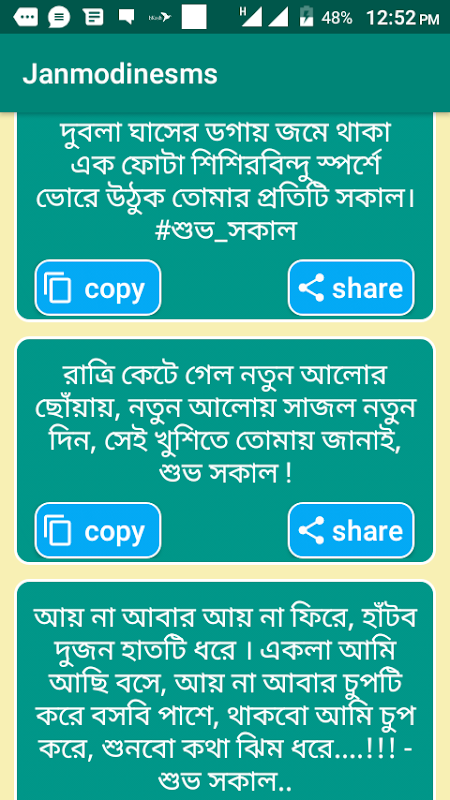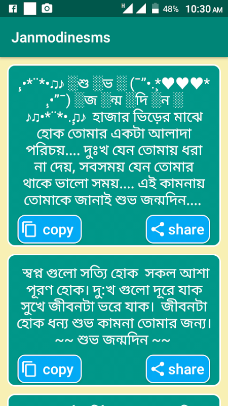 সবাই কে জানাই আন্তরিক অভিন্দন ও জন্মদিনের এসএমএস বন্দুদের পাঠানোর জন্য সুন্দর একটি অ্যাপ। এখানে আপনি পাবেন বাংলায় লিখিত চমৎকার সব মেসেজ। জন্মদিনের এসএমএস টি আপনাদের সকল বন্দু / বান্দবদের মাঝে কপি বা শেয়ার করে পাঠাতে পারবেন। এখানে মঝার মঝার বাংল এসএমএস পড়তে পাড়বেন এবং আপনার প্রিয় মানুষটি কে পাঠাতে পারবেন। এখন থেকে মন খুলে প্রিয় মানুষের কাছে ম্যাসেজে, মেসেন্জারে, ফেসবুকে, ইমোতে এছাড়াও আরো অনেক। কথায় আছে মনের মধ্যে গুরপাক খায় যা মুখে আসে না সেই সব কথা নিয়েই এবসটি সাজানো। এই বাংলা এসএমএস (জন্মদিন এসএমএস) Application টি আপনাদের কেমন লাগলো অবশ্যই জানাবেন। ধন্যবাদ!