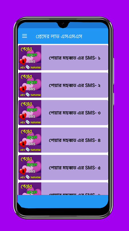 নিত্য নতুন এসএমএস ও স্ট্যাটাস দিয়ে সাজানো এই অ্যাপ্স .এই অ্যাপটিতে অনেক ক্যাটাগরি এড করা হয়েছে . রয়েছে সুন্দর সুন্দর বাছাইকৃত এসএমএস যা সকলের কাছে ভালো লাগবে ,