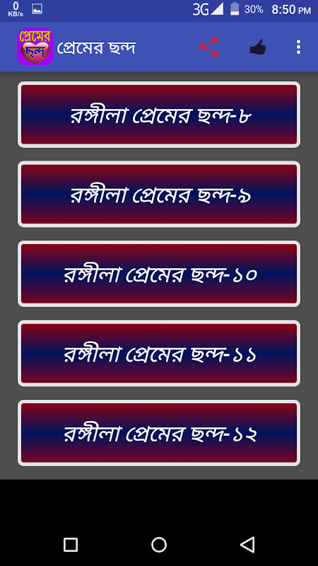> এমন মজার কিছু ছন্দ পাবেন অ্যাপটিতে ছন্দ মন ভালো করার ঔষধ। মনের মানুষকে এমন অনেক অবাক করা ছন্দ বলুন দেখবেন প্রেমে পটাতে বেশি কষ্ট করতে হবেনা।।।