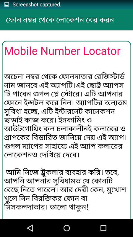 জন্য আমাদের আয়োজন ফোন নম্বর থেকে লোকেশন বের করন/ফোনদাতার ঠিকানা বের করন নামে একটি অ্যাপ । অ্যাপটির মাধ্যমে আপনি ফোনদাতার ঠিকানা বের করা/মোবাইল ফোন থেকে লোকেশন বের করা/ফোন থেকে অবস্থান বের করা/