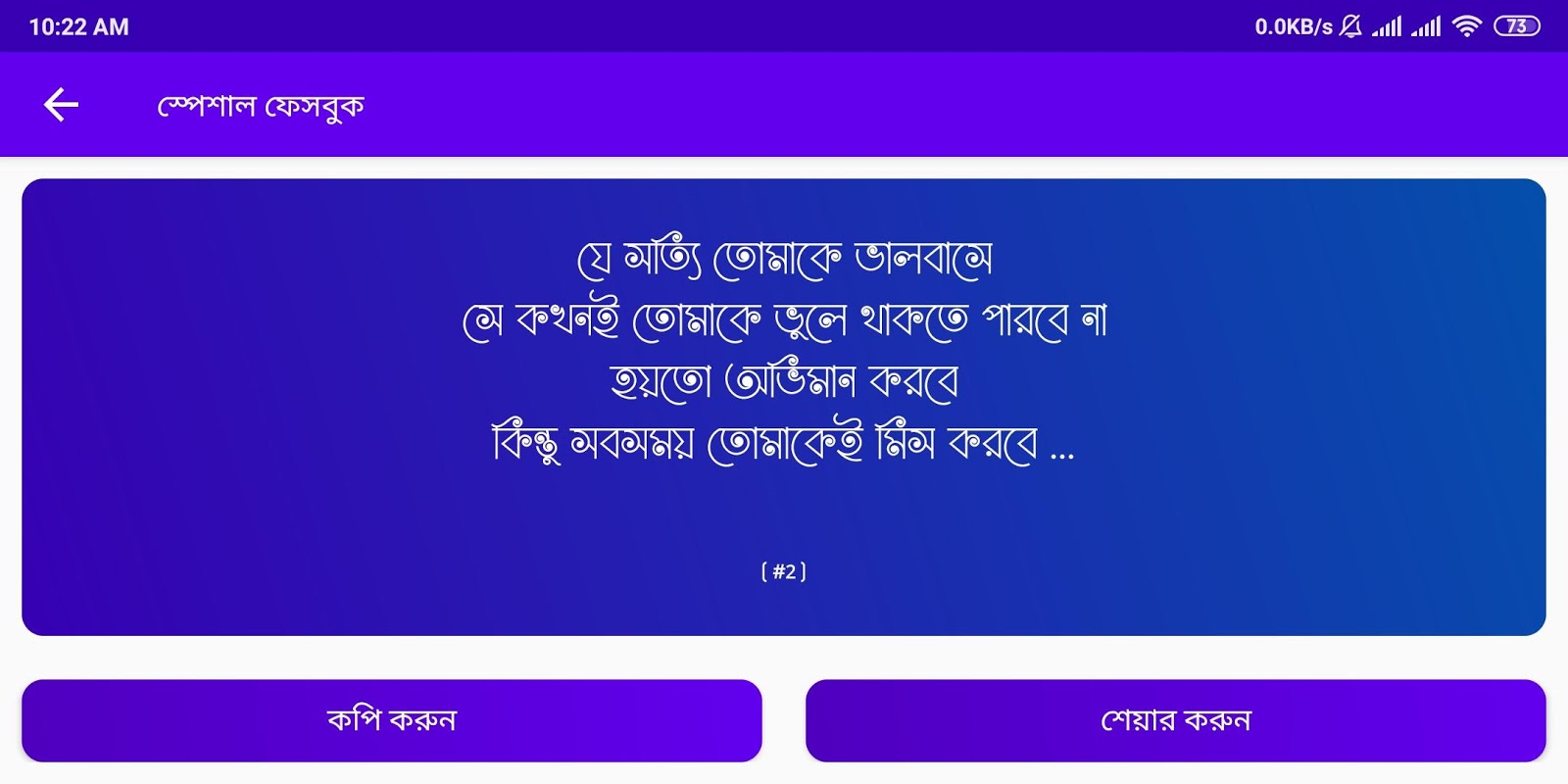বাংলা এসএমএস ও ফেসবুক স্ট্যাটাস অ্যাপে রয়েছে সেরা সব এসএমএস ও ফেসবুক স্ট্যাটাস এর কালেকশন।