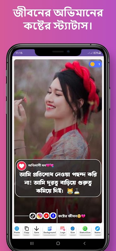 ✔️ কপি ও শেয়ার অপশন: যেকোনো স্ট্যাটাস সহজেই কপি করে শেয়ার করার সুবিধা।