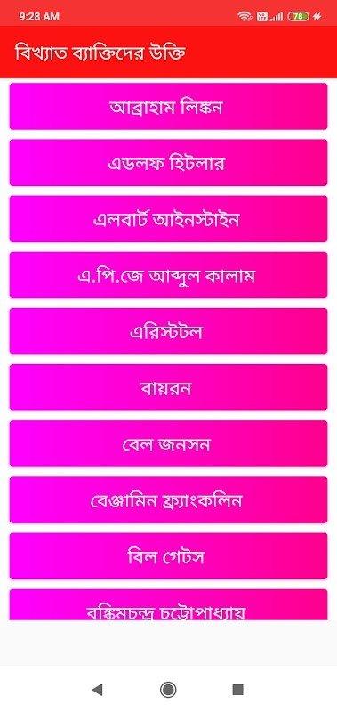 বিখ্যাত উক্তি App- টিতে রয়েছে জীবন বদলে দেওয়ার মতো বিখ্যাত ব্যক্তিদের কিছু উক্তি। বাংলা বিখ্যাত উক্তি যেমন প্রেমের উক্তি, বাংলা বাণী ও জীবন বদলে দেওয়া অনুপ্রেরণামূলক উক্তি। বিখ্যাত ব্যক্তিদের এই সকল উক্তি সমূহ আপনার জীবন ও দৃষ্টিভঙ্গি পরিবর্তন করে দিতে পারে।