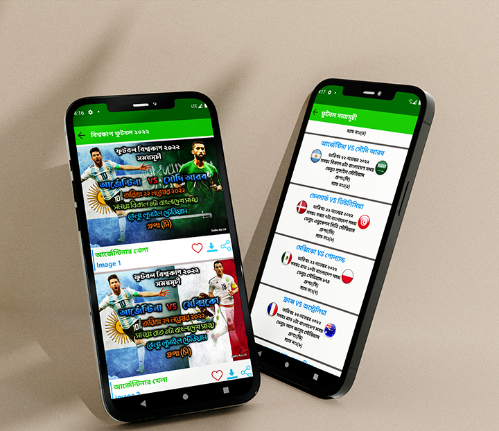 এই অ্যাপটিতে ফুটবল ২০২২ সময়সূচী সম্পর্কে বিস্তারিত জানবেন। এই আপে ফুটবল বিশ্বকাপ ২০২২ এর খেলাগুলোর বাংলাদেশ সময় অনুযায়ী সূচি দেওয়া হয়েছে হয়েছে তাই বিশ্বকাপ ফুটবল ২০২২ এর খুশি পরিবার ও বন্ধুদের সাথে ভাগাভাগি করতে এখনই ডাউনলোড করুন আর ছবি সহ প্রতিটি খেলার পিকচার শেয়ার করুন ও সবাইকে সবাইকে